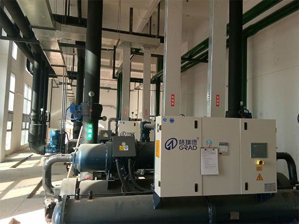 2、水冷螺桿機組適用于大型制冷量需求的建筑,能效比高,運行費用低,維護點少,檢修簡單,設立了獨立機房不影響車間生產噪音干擾。