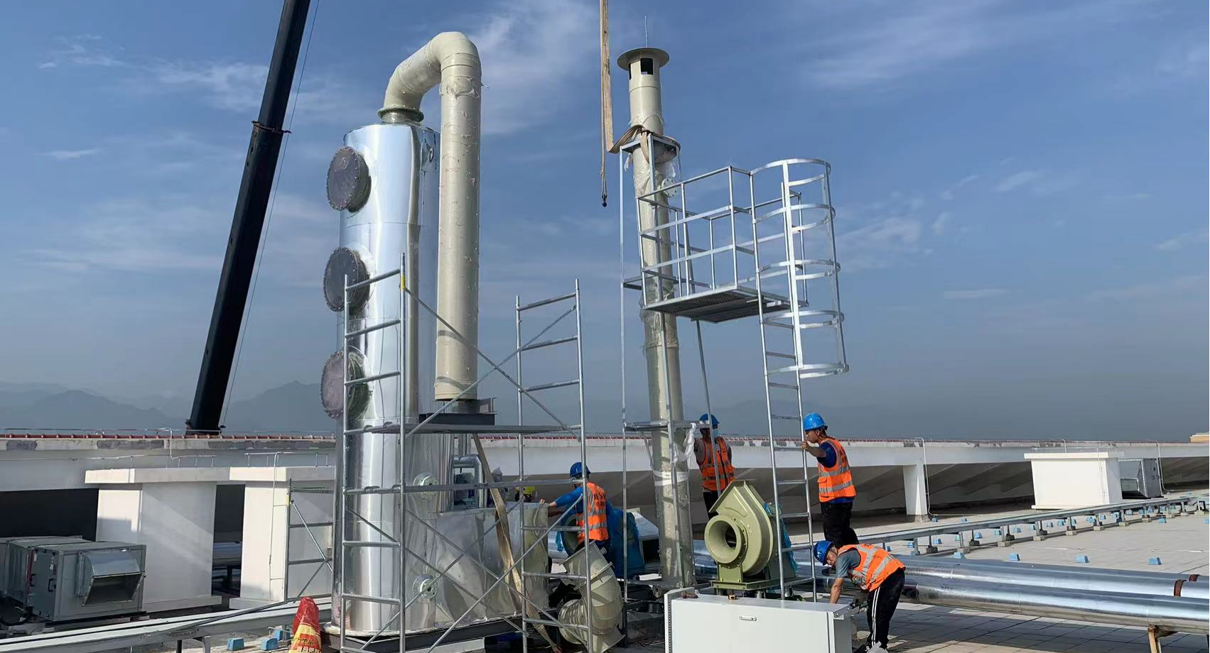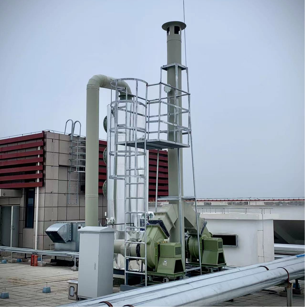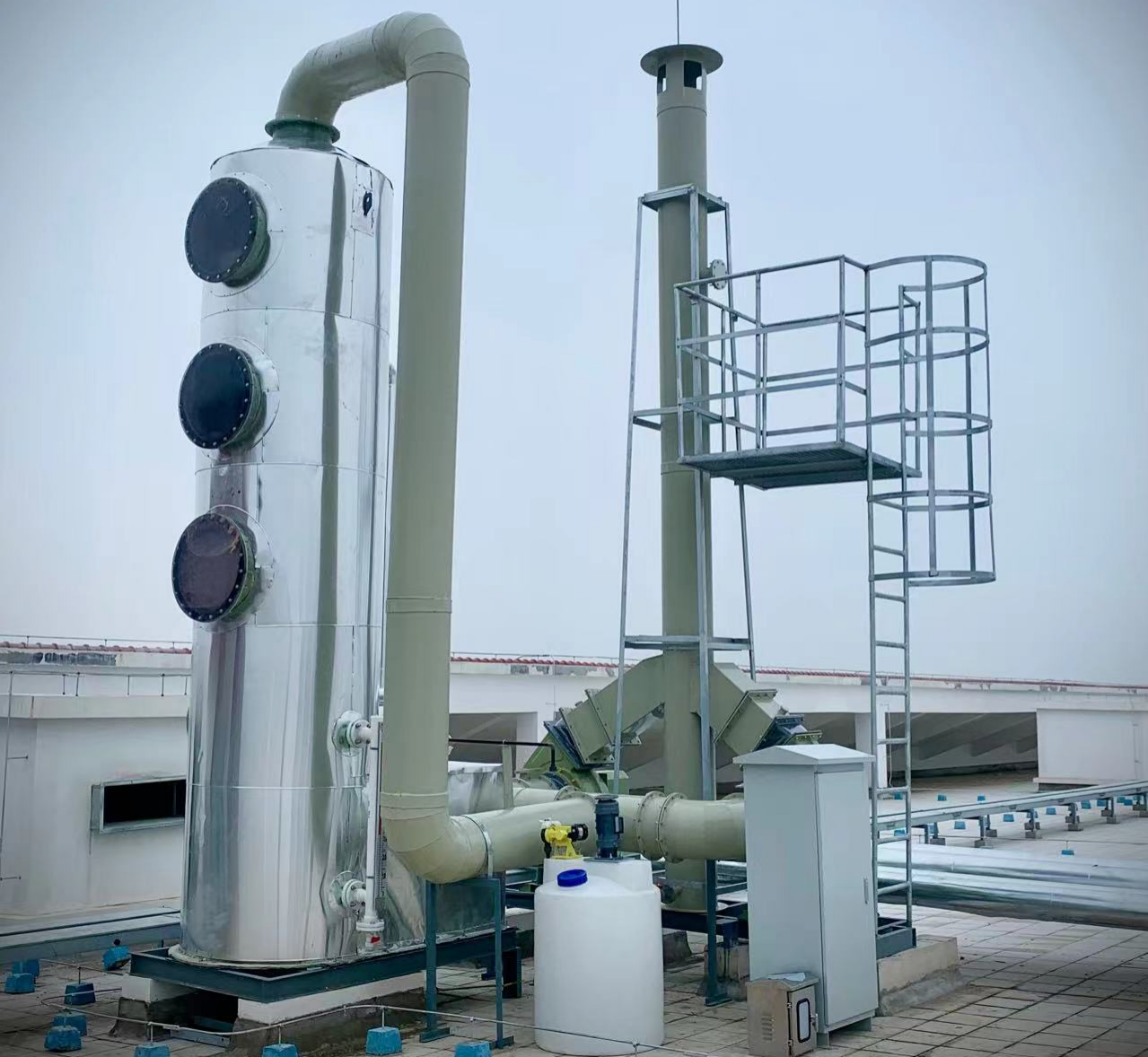 噴淋塔、風機、電控、煙囪支架、檢測平臺、爬梯護欄,設備間連接管道。