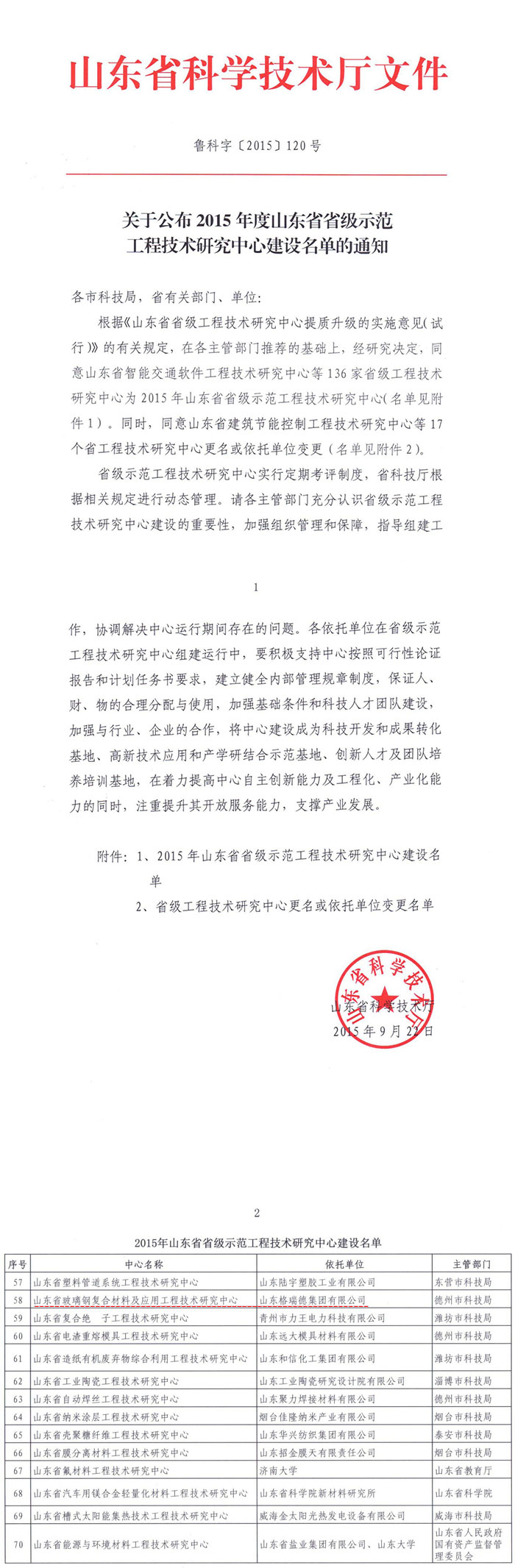 山東省省級(jí)示范工程技術(shù)研究中心批文