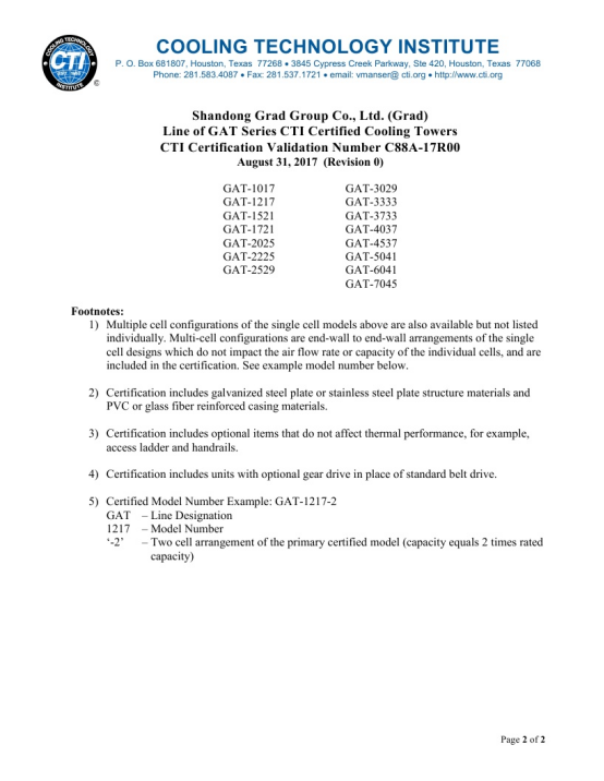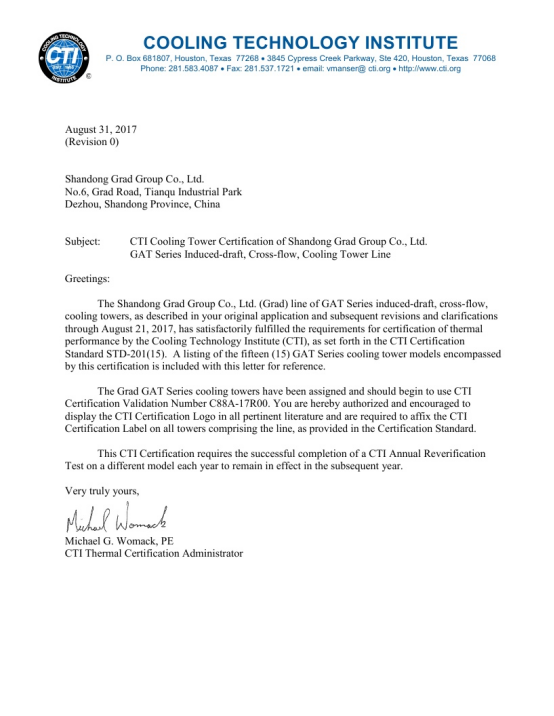 格瑞德冷卻塔公司擁有國家級冷卻塔性能檢測基地,并且入圍中核集團合格供應商。玻璃鋼橫流冷卻塔(GAT系列)產品均通過了國家級權威檢測機構的檢測,其中冷卻塔的熱力性能、漂水率、耗電比、噪音等關鍵技術指標處于國際先進水平,取得了美國CTI認證、中國節水產品認證、中國節能產品認證、中國冷協CCTI認證。