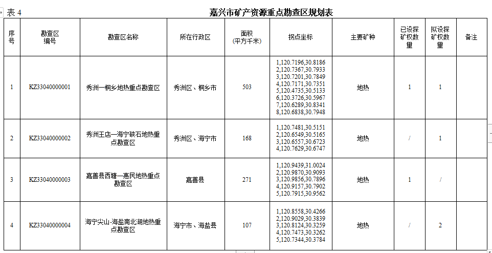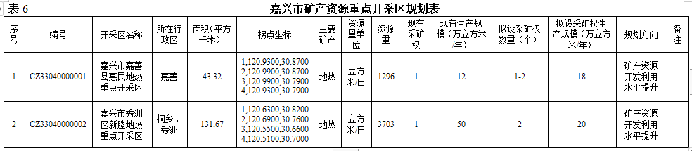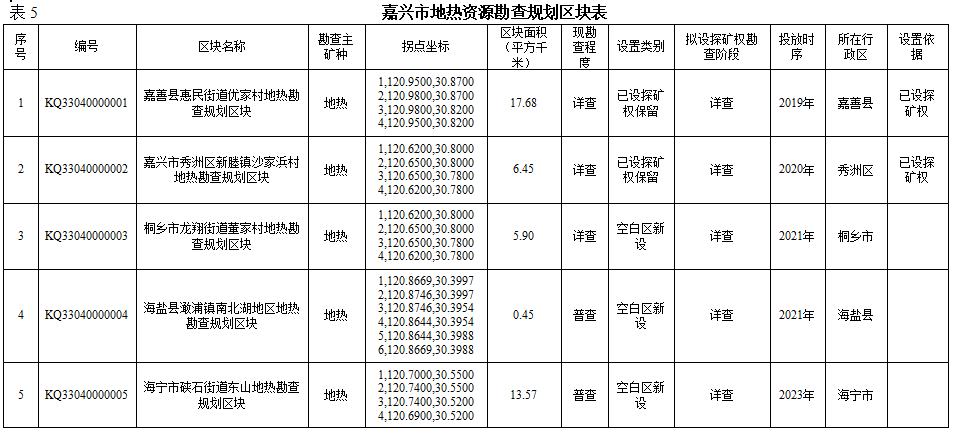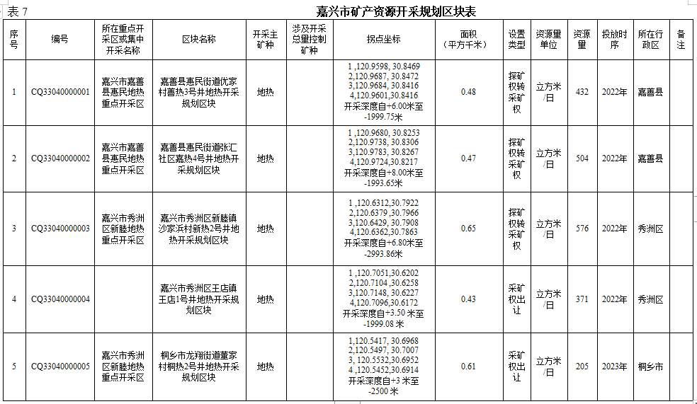 根據(jù)礦業(yè)權(quán)出讓登記管理權(quán)限和礦產(chǎn)資源勘查成果,劃定市、縣兩級出讓登記礦種的開采規(guī)劃區(qū)塊,為探礦權(quán)轉(zhuǎn)采礦權(quán)、登記發(fā)證和監(jiān)管礦產(chǎn)資源開采活動提供依據(jù),劃定5個地熱開采規(guī)劃區(qū)塊,分別為嘉善縣惠民街道優(yōu)家村善熱3號井地熱開采規(guī)劃區(qū)塊、嘉善縣惠民街道張匯社區(qū)嘉熱4號井地熱開采規(guī)劃區(qū)塊、嘉興市秀洲區(qū)新塍鎮(zhèn)沙家浜村新熱2號井地熱開采規(guī)劃區(qū)塊、嘉興市秀洲區(qū)王店鎮(zhèn)王店1號井地熱開采規(guī)劃區(qū)塊、桐鄉(xiāng)市龍翔街道董家村桐熱2號井地熱開采規(guī)劃區(qū)塊。
