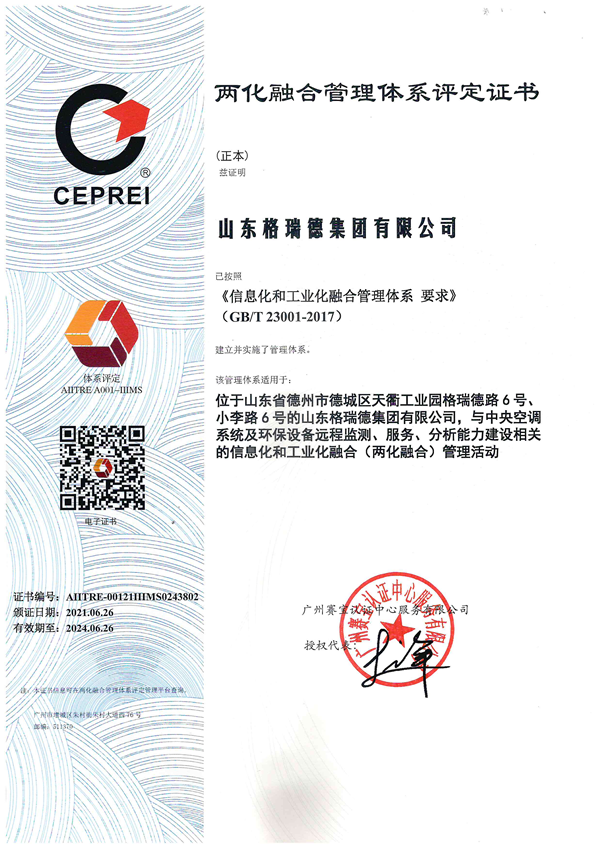 格瑞德集團(tuán)自2017年起,積極開展兩化融合貫標(biāo)工作,加大力度投入信息化建設(shè),推動(dòng)集團(tuán)業(yè)務(wù)發(fā)展。2018年第一次完成兩化融合管理體系認(rèn)證工作,依托商務(wù)運(yùn)營平臺(tái)、U9ERP系統(tǒng)以“供產(chǎn)銷財(cái)務(wù)一體化管控能力”獲得第一次認(rèn)證證書,成為德州市前三家獲得此認(rèn)證的企業(yè)。2021年,集團(tuán)迎來體系換證工作,再次依托應(yīng)用物聯(lián)網(wǎng)技術(shù)的中央空調(diào)系統(tǒng)運(yùn)行智能監(jiān)測控制平臺(tái)、環(huán)保系統(tǒng)運(yùn)行智能監(jiān)測控制平臺(tái),以“中央空調(diào)系統(tǒng)及環(huán)保設(shè)備遠(yuǎn)程監(jiān)測、服務(wù)、分析能力”順利獲得認(rèn)證證書。