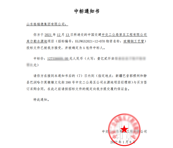 近日,格瑞德集團成功中標中交二公局庫爾勒第二水源地項目,中標金額近1.3億元。該項目為格瑞德集團2022年業務開展奠定了良好的基礎,注入了強有力的動力。