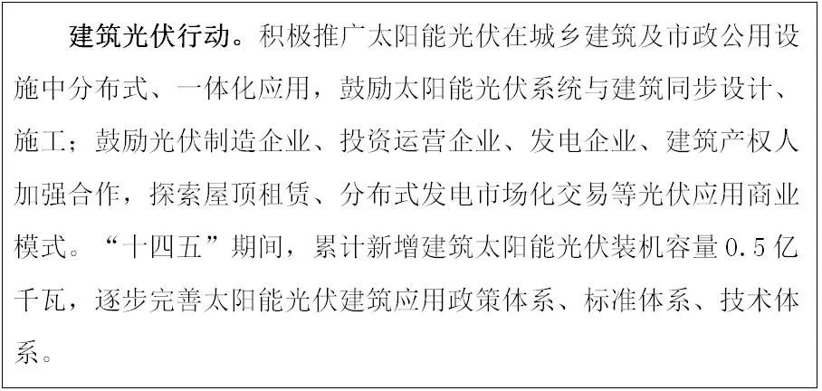 1.推動太陽能建筑應用。根據太陽能資源條件、建筑利用條件和用能需求,統籌太陽能光伏和太陽能光熱系統建筑應用,宜電則電,宜熱則熱。推進新建建筑太陽能光伏一體化設計、施工、安裝,鼓勵政府投資公益性建筑加強太陽能光伏應用。加裝建筑光伏的,應保證建筑或設施結構安全、防火安全,并應事先評估建筑屋頂、墻體、附屬設施及市政公用設施上安裝太陽能光伏系統的潛力。建筑太陽能光伏系統應具備即時斷電并進入無危險狀態的能力,且應與建筑本體牢固連接,保證不漏水不滲水。不符合安全要求的光伏系統應立即停用,棄用的建筑太陽能光伏系統必須及時拆除。開展以智能光伏系統為核心,以儲能、建筑電力需求響應等新技術為載體的區域級光伏分布式應用示范。在城市酒店、學校和醫院等有穩定熱水需求的公共建筑中積極推廣太陽能光熱技術。在農村地區積極推廣被動式太陽能房等適宜技術。