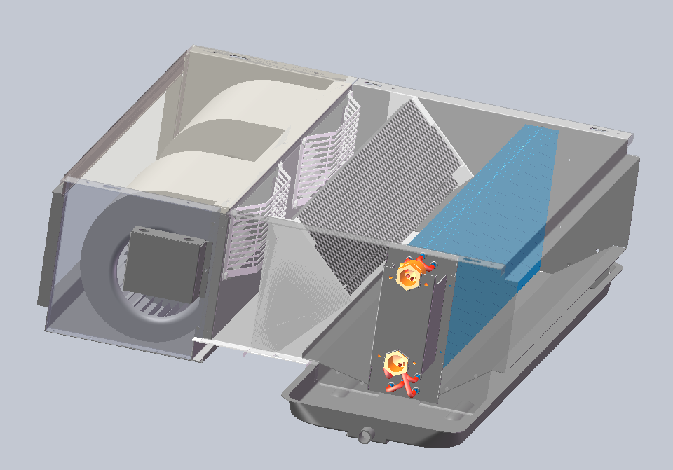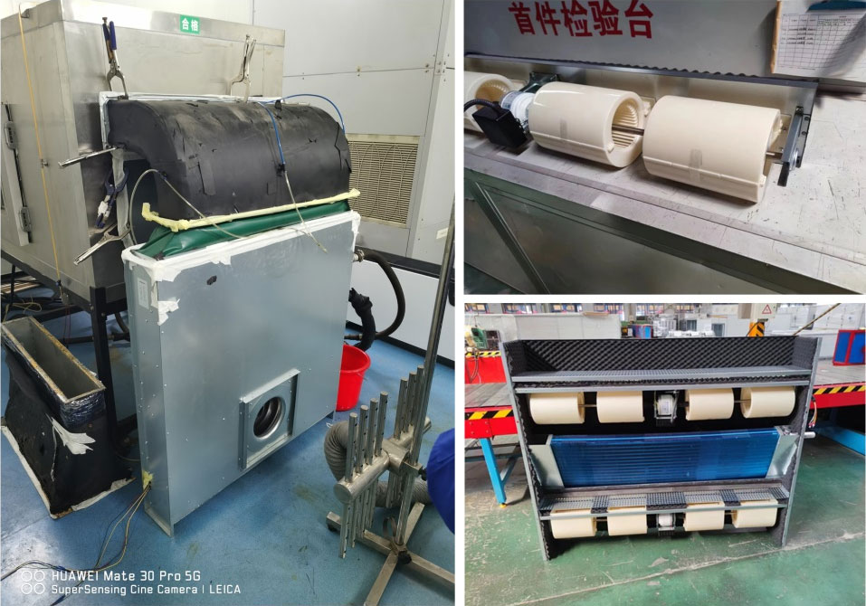 在疫情防控的關鍵期,市面上相繼推出凈化型風機盤管機組,但是這類機組的過濾網都是裝在進風口的,回風箱里是負壓狀態,如果密封不好送風凈化效率將大受影響。針對這一弊端,團隊人員對現有風機盤管機組進行技術改進,經過反復測算,調整測試,確定將過濾網放置于風機表冷器之間的正壓區,這樣就保證了送到風口的風都是凈化過濾后的,凈化效率大大提升。
