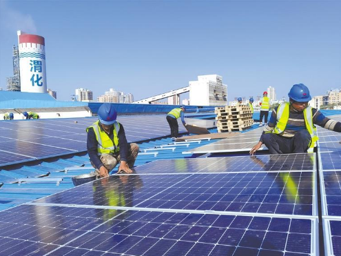 夏日里,在陜煤集團(tuán)陜西渭河煤化工集團(tuán)有限責(zé)任公司(以下簡(jiǎn)稱渭化集團(tuán))尿素車間大棚屋頂上,一排排光伏發(fā)電板在陽光下泛著耀眼的光,猶如一片藍(lán)色海洋。施工人員正在加緊建設(shè),他們將利用公司的尿素車間大棚屋頂建設(shè)近2萬平方米的光伏項(xiàng)目。