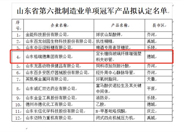 近日,山東省工信廳公示了第六批省制造業單項冠軍擬認定名單和第三批復核擬通過名單,集團定長纏繞玻璃纖維增強塑料夾砂管產品上榜山東省制造業單項冠軍產品擬認定名單。
