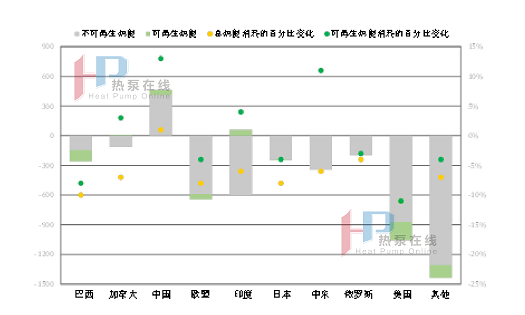 據國際能源署(IEA)統計數據,圖3-8給出了7個國家或地區工業用熱量同比變化,受疫情影響,除中國外其他國家或地區2020年的工業熱能消耗較之于2019年有不同幅度的降低;而中國經濟復蘇表現強勁,工業用不可再生熱能以及可再生熱能消耗量分別提高了412×106GJ、50×106GJ,同比增長1%及13%。根據該數據估計,2020年中國工業用可再生熱量僅占工業用總熱能消耗的0.83%。顯然,碳中和目標的達成過程中的可再生熱量的比例遠遠不足,必須對高耗能行業的工藝流程進行根本性的改變。工業轉型最前沿的脫碳選擇是:通過提高工藝效率和新工藝來減少最終能源消耗,余熱回收以及使用可再生能源代替化石能源。這里,熱泵技術能夠作為工業部門碳中和的解決方案之一,為我國工業部門減少二氧化碳排放提供一條可行的路徑。