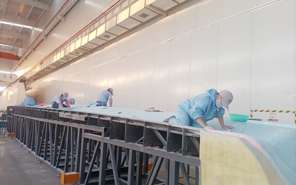 該項目是格瑞德集團首次從模具鋼架加工開始,全過程制作葉片陽模模具。集團接到葉片陽模項目訂單后,按照甲方技術質量標準參數要求,首先對原材料供應商物料的技術質量等參數能否達標進行評定,優中選優,確保采購物料各項指標達標;技術聯合生產利用CNC設備,從鋼架焊接、激光測量鋼架型面、糊制、鋪設伐木等工序加工制作成品,并順利完成制作。