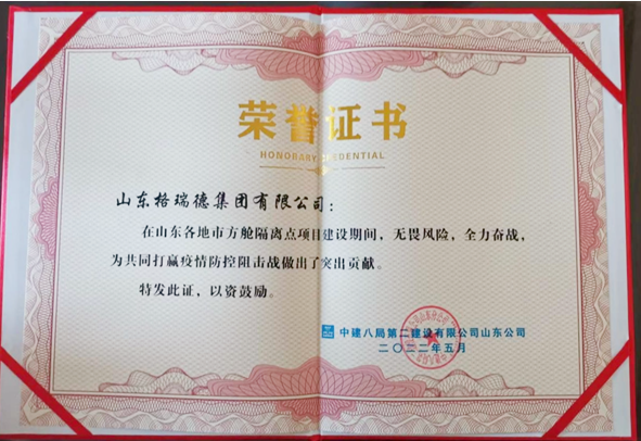 格瑞德集團臨危受命,先后承攬臨沂市羅莊區、莒南縣、河東區隔離病房通風及過濾設備生產任務,由格瑞德集團生產的183臺高效低噪音斜流風機、2臺防爆斜流風機、144臺凈化空調器僅用5天時間完成生產工作。格瑞德集團高效、高速、高質量的技術品質榮獲甲方客戶授予“疫情防控阻擊戰先進單位”稱號。