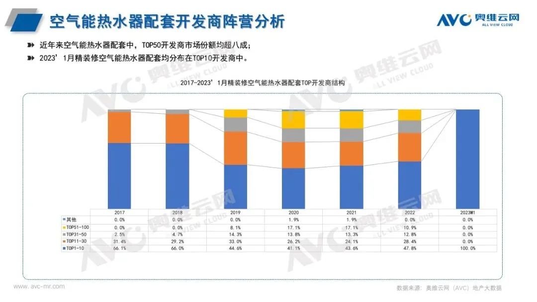 從近年空氣能熱水器市場來看,近年來空氣能熱水器主力戰場始終是華東區。從近年城市等級分布來看,空氣能熱水器集中分布在新一線城市和二線城市中,合計份額均在七成以上,從單個城市來看,近年來空氣能熱水器重點城市主要為杭州,寧波、紹興、溫州等,從開發商陣營來看,近年來空氣能熱水器配套中,TOP50開發商市場份額均超八成,其中TOP10開發商市場份額均為40%以上, 2023年1月精裝修市場空氣能熱水器配套均分布在TOP10開發商中。