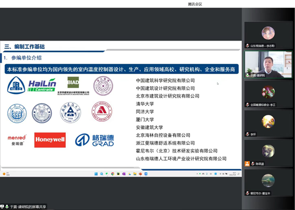 11月9日,由全國暖通空調及凈化設備標準化技術委員會(以下簡稱全國暖通標委會)聯合中國建筑科學研究院有限公司組織召開《室內溫度控制器通用技術條件》國家標準編制組成立暨第一次工作會議,會議采用線上方式進行。格瑞德集團作為參編組成員出席本次會議。