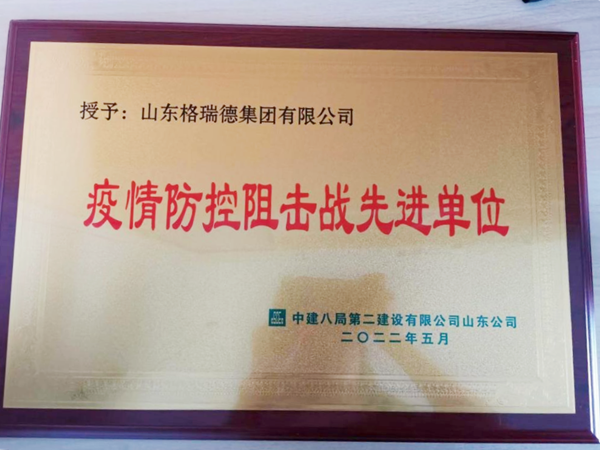 4月,格瑞德集團獲得中建八局第二建設公司山東公司項目“疫情防控阻擊戰先進單位”稱號,此榮譽標志著客戶對集團品牌、產品質量、服務等方面的高度認可,充分的證明了合作伙伴對格瑞德集團的信任與肯定。