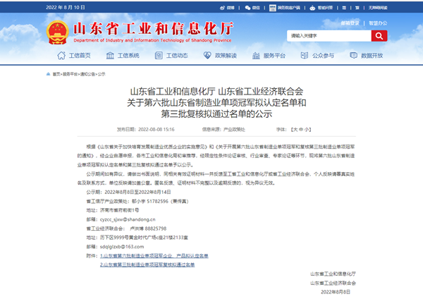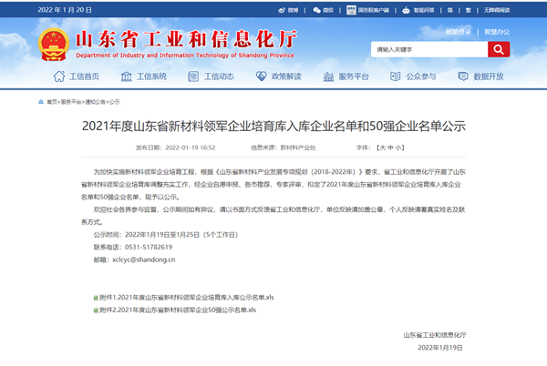 1月19日,山東省工信廳發布《2021年度山東省新材料領軍企業入庫名單及50強名單公示》,集團成功入選2021年度山東省新材料領軍企業50強,此次是繼2019年度入圍后的再次入圍。