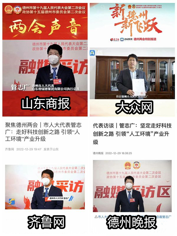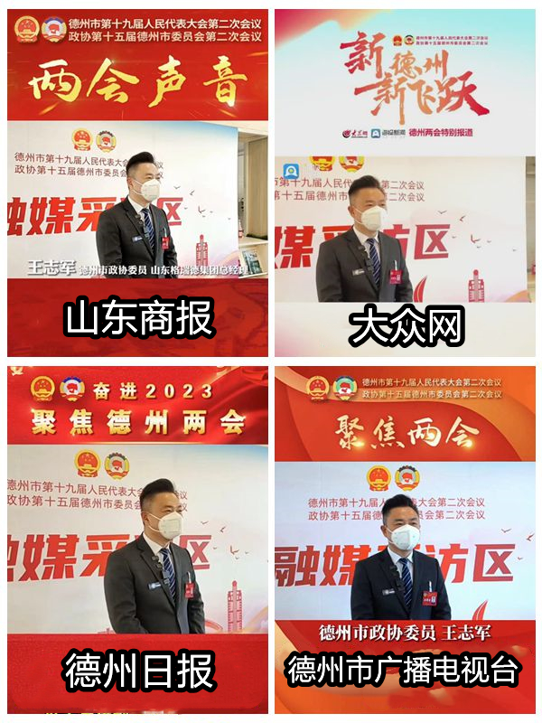 集團執行總裁管志廣、總經理王志軍在大會期間積極建言,代表德州企業出謀劃策,受到多家媒體的關注。齊魯網、大眾網、山東商報、德州晚報、德州電視臺、德州日報等多家媒體分別進行了專訪,形成宣傳稿件、宣傳視頻達十三起。兩位領導積極通過媒體發聲諫言,充分展現集團2022年的發展成果及彰顯格瑞德集團勇擔制造業科技創新大任的魄力。