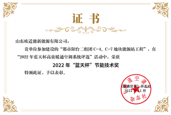 2022年12月9日,素有暖通行業“奧斯卡”之稱的“藍天杯”高效暖通空調系統評選結果正式揭曉,由格瑞德集團助力甲方單位山東歐適能新能源有限公司榮獲全國2022年“藍天杯”節能技術獎,開啟機電安裝工程的智能、高效、安全、綠色新篇章。