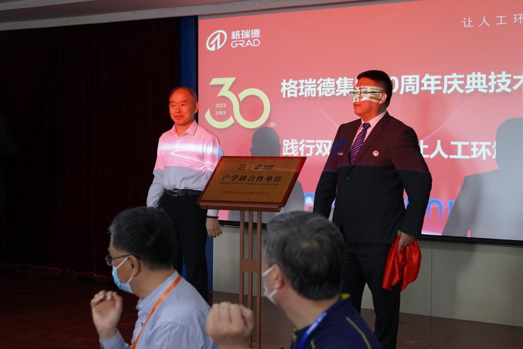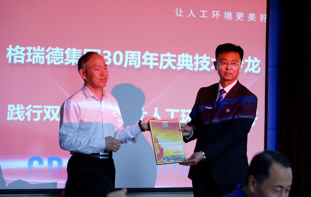座談會現(xiàn)場,合肥通用機電產(chǎn)品檢測院有限公司副院長李道平與潔凈空調(diào)工程公司總經(jīng)理徐紅剛共同為山東格瑞德集團有限公司與合肥通用機電產(chǎn)品檢測院產(chǎn)學研合作單位揭牌,此次合作標志著雙方產(chǎn)學研合作關系邁入新階段,雙方將攜手同行,共同致力于暖通空調(diào)產(chǎn)品技術的深度研發(fā)。隨后,合肥通用機電產(chǎn)品檢測院有限公司副院長李道平授予山東格瑞德集團有限公司離心式冷水機組產(chǎn)品特性認證證書,充分體現(xiàn)了格瑞德集團先進的技術研發(fā)水平。
