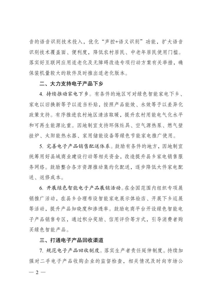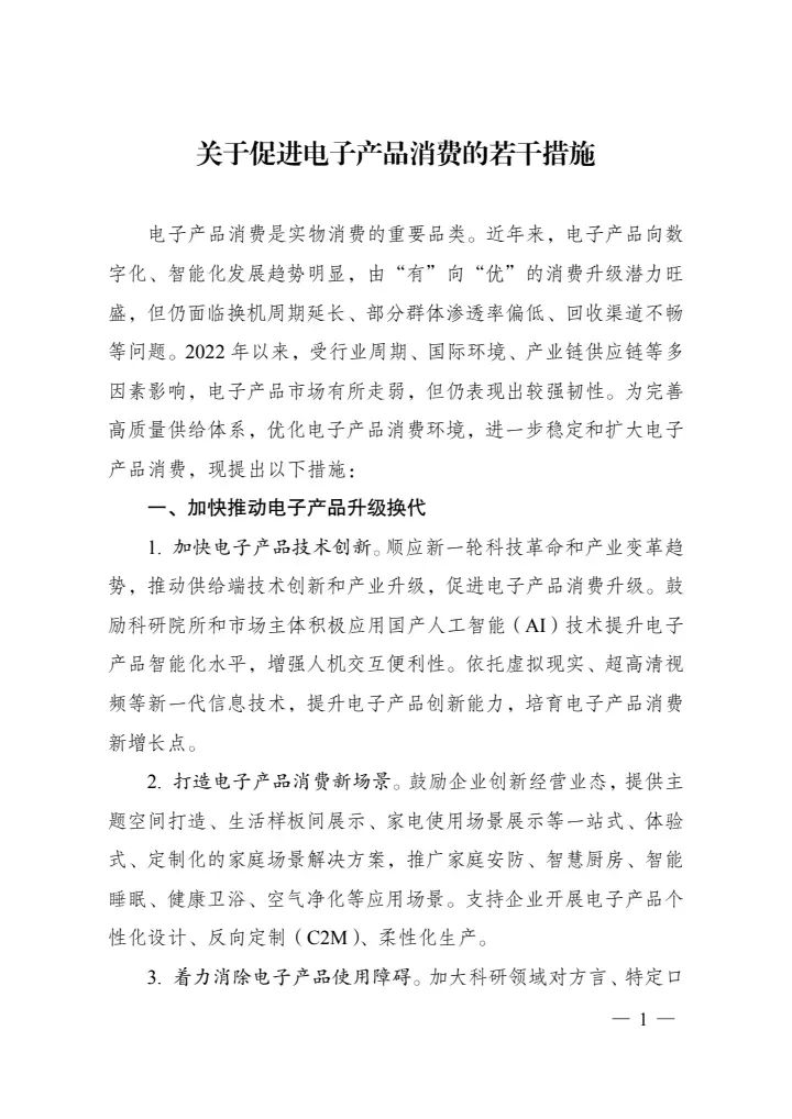 7月21日,國家發改委等部門印發《關于促進電子產品消費的若干措施》,措施中提到,為有效促進電子產品消費,助力消費恢復和擴大。持續推動家電下鄉。有條件的地區可對綠色智能家電下鄉、家電以舊換新等予以適當補貼,按照產品能效、水效等予以差異化政策支持。有序推進農村地區清潔取暖,提升農村用能電氣化水平和可再生能源比重。因地制宜支持環保灶具、空氣源熱泵、燃氣壁掛爐、太陽能熱水器、家用儲能設備等綠色節能家電推廣使用。