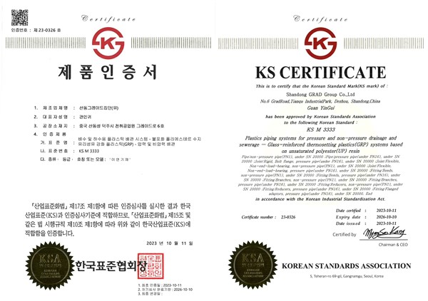 2023年10月11日,格瑞德集團獲得韓國工業標準協會頒發的韓國KS產品認證證書。韓國KS認證是指對能夠持續、穩定生產韓國工業標準以上產品的企業,進行嚴格的審核,使其能夠加貼KS標志的國家認證制度,通過KS認證證明格瑞德生產的玻璃鋼管道完全符合韓國標準,使產品在進入國際市場時更容易被市場所接受,更具競爭力,對提高公司在國際市場的品牌聲譽有很大的推動作用。目前,中國玻璃鋼管道產品,格瑞德是第一家取得韓國KS產品認證的公司。