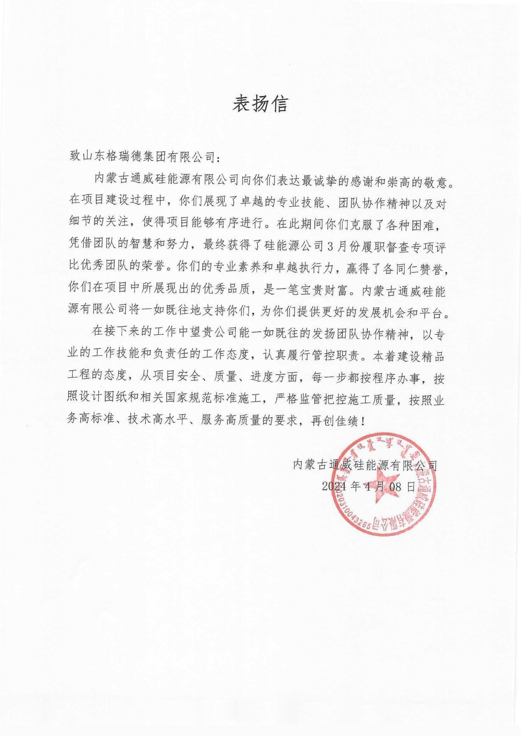 在內(nèi)蒙古通威硅能源公司3月份履職督查專項(xiàng)評(píng)比中,格瑞德項(xiàng)目部榮獲優(yōu)秀團(tuán)隊(duì)的榮譽(yù)。
