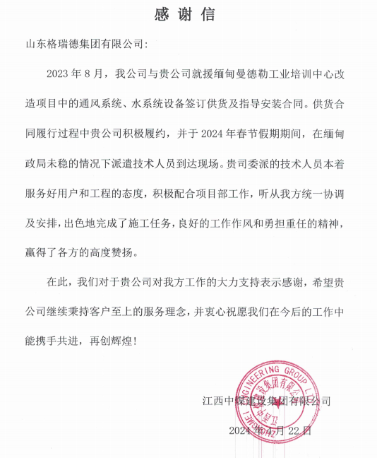 近日,江西中煤建設(shè)集團(tuán)有限公司向格瑞德集團(tuán)發(fā)來表揚(yáng)信,對(duì)公司在援緬甸曼德勒工業(yè)培訓(xùn)中心改造項(xiàng)目中所展現(xiàn)出的專業(yè)素養(yǎng)和高效服務(wù)給予高度評(píng)價(jià)。