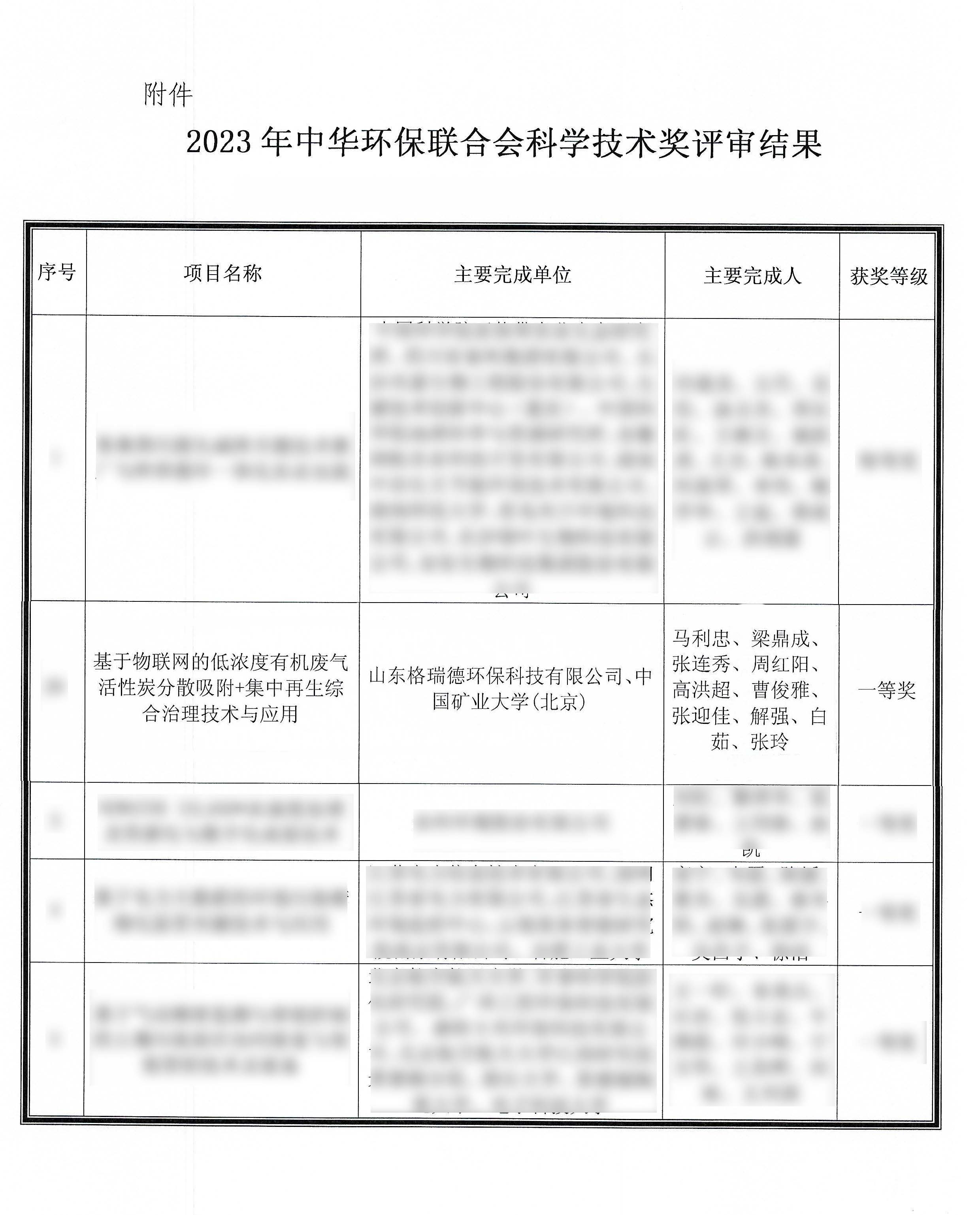 近日,中華環(huán)保聯(lián)合會公布《關(guān)于公示2023年度科學技術(shù)獎評審結(jié)果的公告》,由山東格瑞德環(huán)保科技有限公司、中國礦業(yè)大學(北京)聯(lián)合申報的《基于物聯(lián)網(wǎng)的低濃度有機廢氣活性炭分散吸附+集中再生綜合治理技術(shù)與應(yīng)用》項目榮獲2023年度中華環(huán)保聯(lián)合會科學技術(shù)獎一等獎。