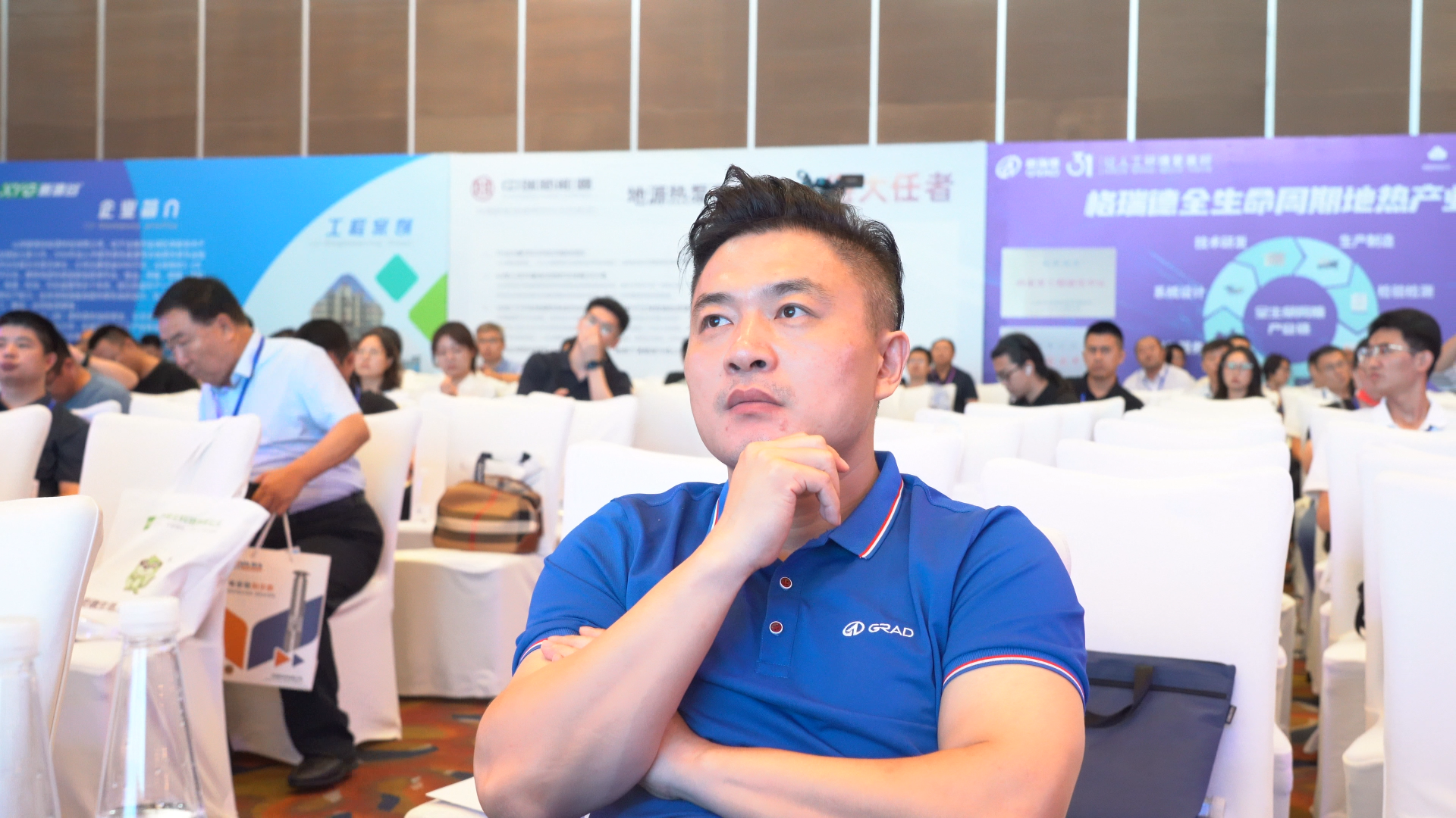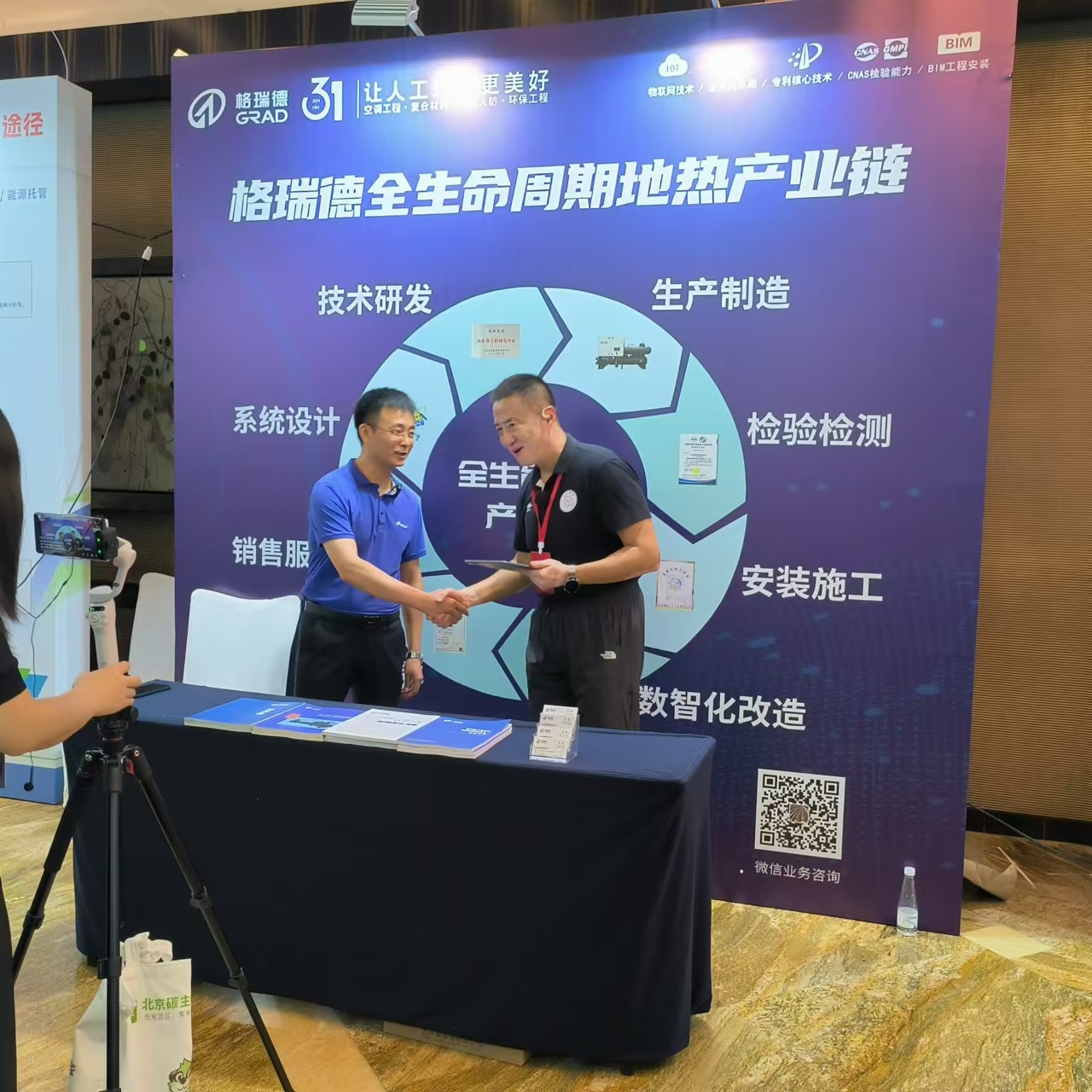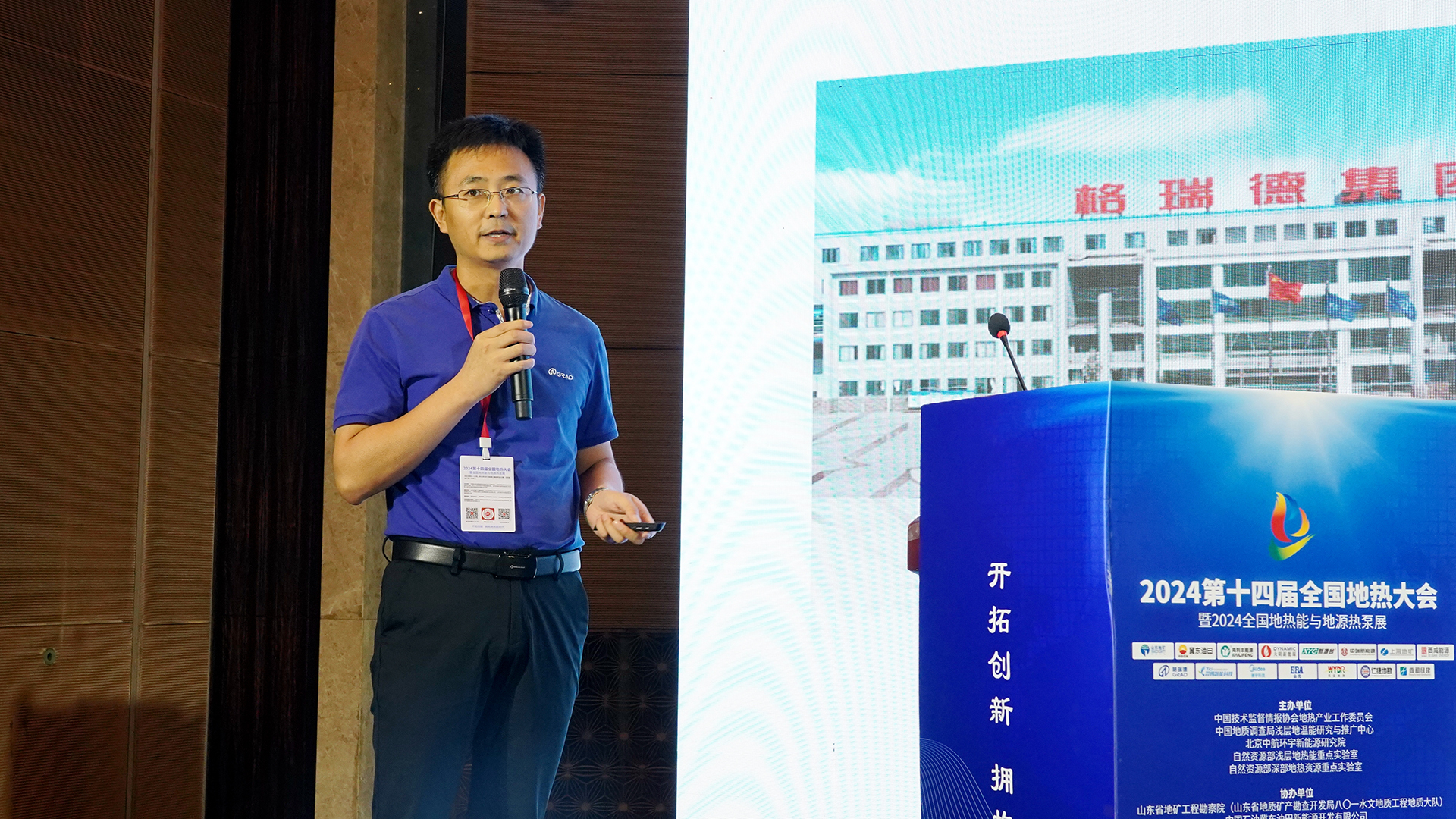 地?zé)峒盁岜卯a(chǎn)業(yè)研究中心副主任王濤以“格瑞德全生命周期地?zé)岙a(chǎn)業(yè)鏈”為主題進行現(xiàn)場宣講,詳細展示集團系統(tǒng)設(shè)計、技術(shù)研發(fā)、生產(chǎn)制造、檢驗檢測、維修保養(yǎng)、數(shù)智化改造、銷售服務(wù)等各環(huán)節(jié)的服務(wù)能力,并就公司在淺層地源熱泵、地?zé)嵛菜谩⒅猩顚永谩⒏袢鸬耂ys+物聯(lián)網(wǎng)技術(shù)等領(lǐng)域的經(jīng)典案例向與會人員全面展示格瑞德工程承攬能力。