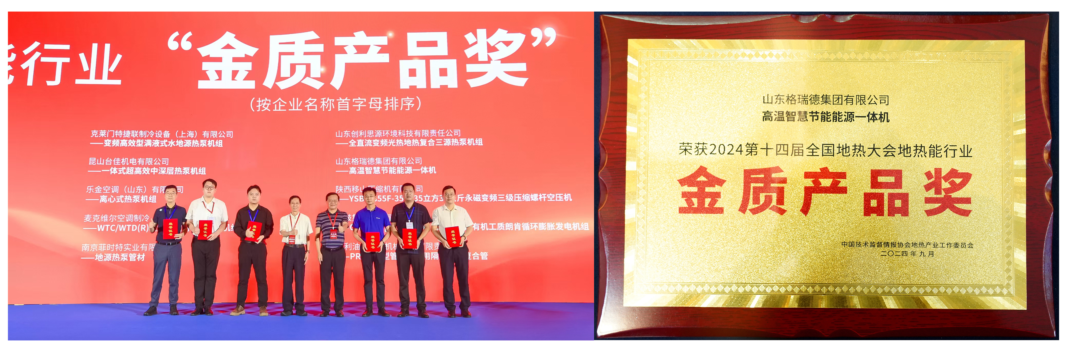 值得一提的是,集團在本次大會上憑借“高溫智慧節(jié)能能源一體機”獲得地?zé)崮苄袠I(yè)金質(zhì)產(chǎn)品獎,“中共臨邑縣委黨校地源熱泵項目”獲得地?zé)崮苄袠I(yè)優(yōu)質(zhì)工程獎。兩個獎項的獲得,標(biāo)志著集團不僅在地?zé)岙a(chǎn)品制造方面成就卓越,在系統(tǒng)工程承攬方面也具備超強實力,再次彰顯格瑞德集團在地?zé)嵝袠I(yè)的重要地位。
