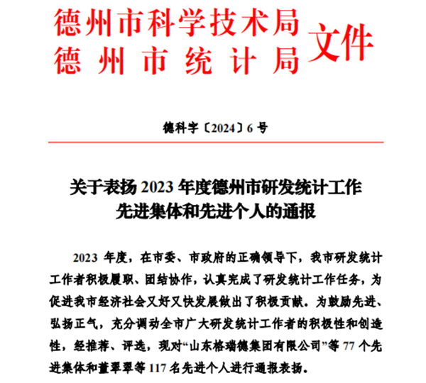 2月,德州市科學技術局、德州市統計局聯合召開2024年度德州市研發統計工作會議。會議公示表揚了2023年度研發統計工作先進集體和先進個人。格瑞德集團憑借卓越的研發創新實力,成功榮獲“研發統計工作先進集體”稱號。