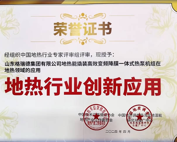 4月,格瑞德集團受邀參加2024四川(成都)地熱高質量發展大會,會上集團憑借地熱能撬裝高效變頻降膜一體式熱泵機組在地熱領域的卓越應用,經過中國地熱行業專家評審組的嚴格評審,榮獲地熱行業創新應用獎。