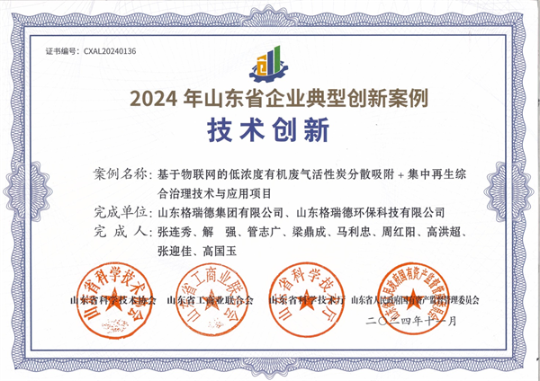 11月,山東省科學技術協會公示2024年山東省企業典型創新案例入選名單,格瑞德集團與環保科技公司共同研發的“基于物聯網的低濃度有機廢氣活性炭分散吸附+集中再生綜合治理技術與應用項目” 憑借在有機廢氣治理方面的先進性和創新性成功入選。