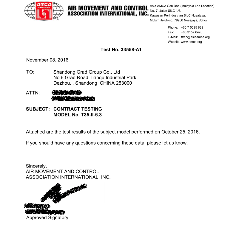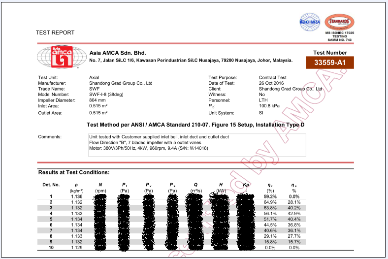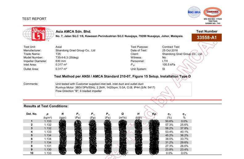 此次集團正在申報辦理的SWF系列、T35系列風機CRP產品性能認證,已由AMCA亞洲區域馬來西亞實驗室完成空氣動力性能、噪音測試工作,測試結果均合格,風機能效等級分別達到FEG67、FEG60,充分顯示了格瑞德集團風機產品的優異性能,為產品獲得最終認證奠定了基礎,也為風機系列產品進軍國際市場拿到了“入場券”。