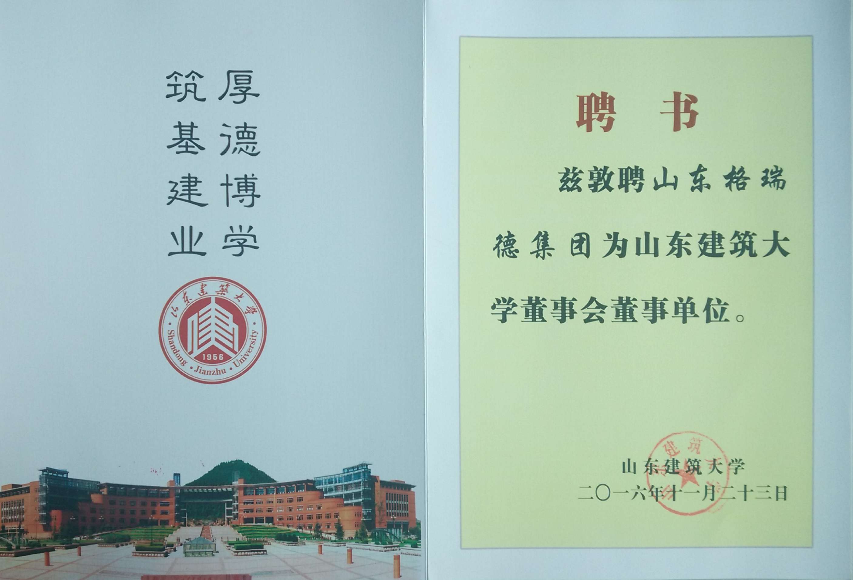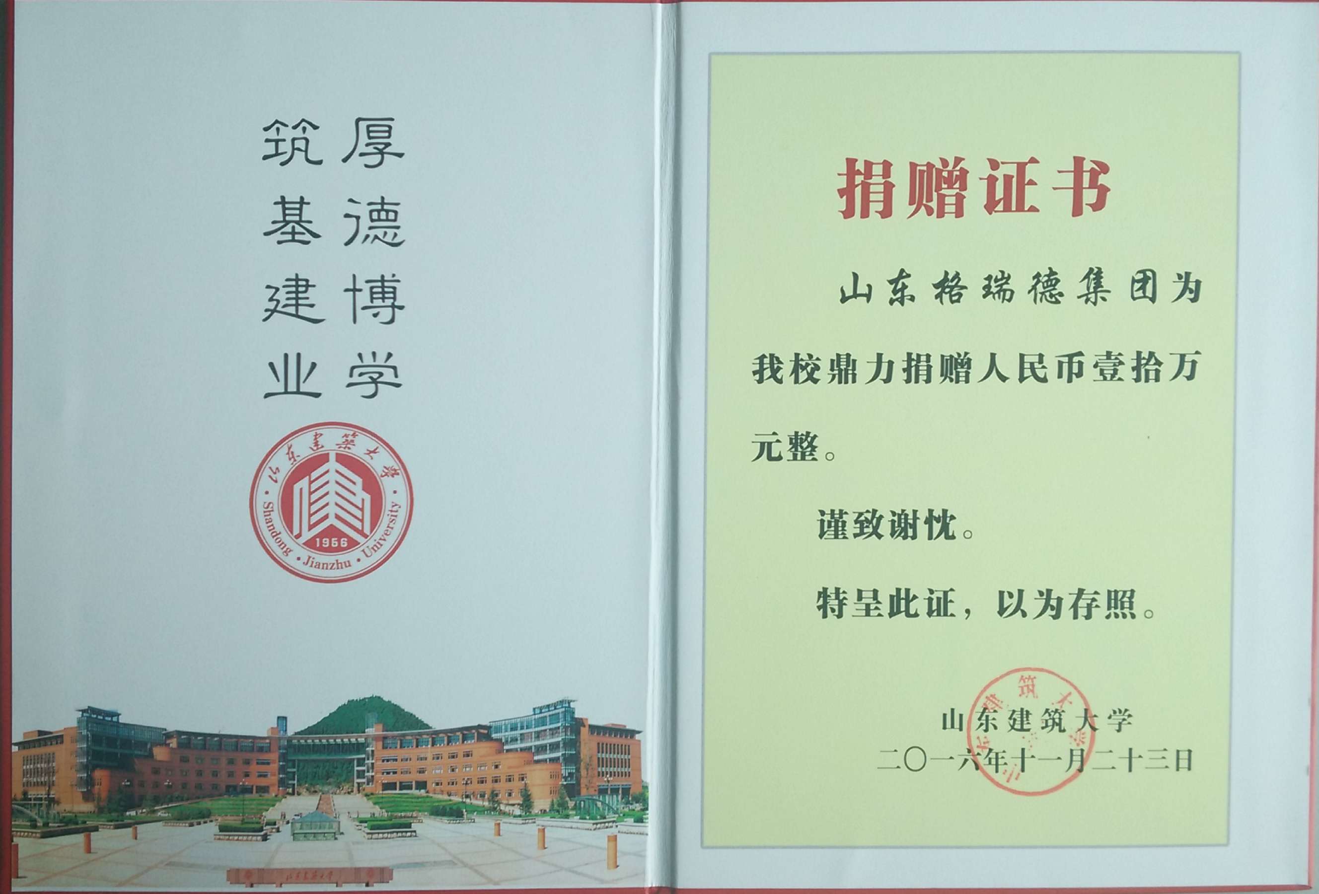11月25日,山東格瑞德集團捐贈儀式暨校企合作座談會在山東建筑大學召開,集團董事長管印貴、行政總監馬利忠以及業務接待部長尹興華參會,山建副校長范存禮參會。