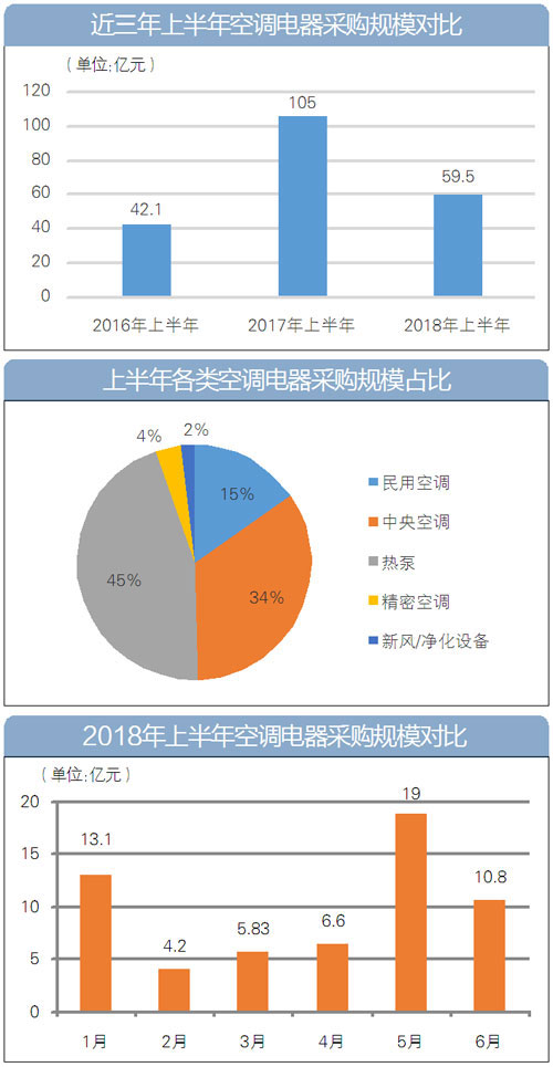 上半年,全國共完成空調電器采購項目數量逾2000個,采購總金額約59.5億元。從產品上來看,其中,以空氣源熱泵機組為主的冬季清潔取暖設備采購額26.8億元,占比45%;中央空調和民用空調采購市場也有不俗表現。本期,我們將為您詳細分析上半年空調電器采購情況。