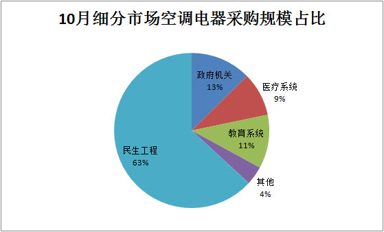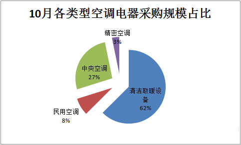 從產品方面看,10月清潔取暖設備采購規模18.1億元,占比62%;排在第二的是中央空調,采購規模4.3億元,占比27%;民用空調位居其三,采購規模為1.23億元。