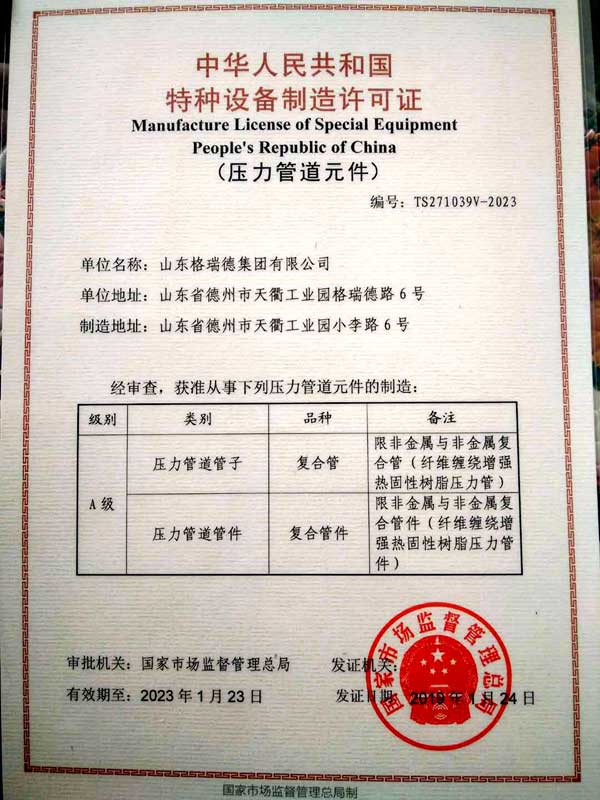 2018年7月,根據當前玻璃鋼管道工程的承攬需求,格瑞德集團纏繞公司董作軍總經理提出辦理壓力管道元件特種設備制造許可證的要求,自2018年7月31日正式向國家市場監督管理總局提交許可申請書到2019年1月24日正式發證,歷經6個月。6個月的時間里,在纏繞公司各個部門通力合作、集團公司相關部門的大力支持下,順利完成了特種設備質量保證手冊、特種設備程序文件、相關作業文件、相關管理制度的編制工作;完成了產品的試制及實驗工作;并于2018年11月15日至16日順利通過中國工業防腐蝕技術協會的現場審核工作。