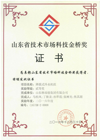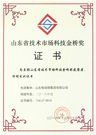 為認真貫徹落實省委省政府決策部署,全面深化科技體制改革、深入實施創新驅動發展戰略,充分發揮科技金橋獎橋梁紐帶作用,表彰在全省技術市場工作中做出突出貢獻的集體、個人和優秀科技成果轉化項目,近日,依據《山東省技術市場科技金橋獎獎勵辦法》并經專業組評審、評審委員會評審、獎勵委員會評審,山東省技術市場科技金橋獎獎勵委員會發布了《關于2016年度山東省技術市場科技金橋獎獎勵的決定》,山東格瑞德集團有限公司獲得山東省技術市場科技金橋獎先進集體獎;集團降膜式冷水機組榮獲山東省技術市場科技金橋獎優秀項目二等獎。