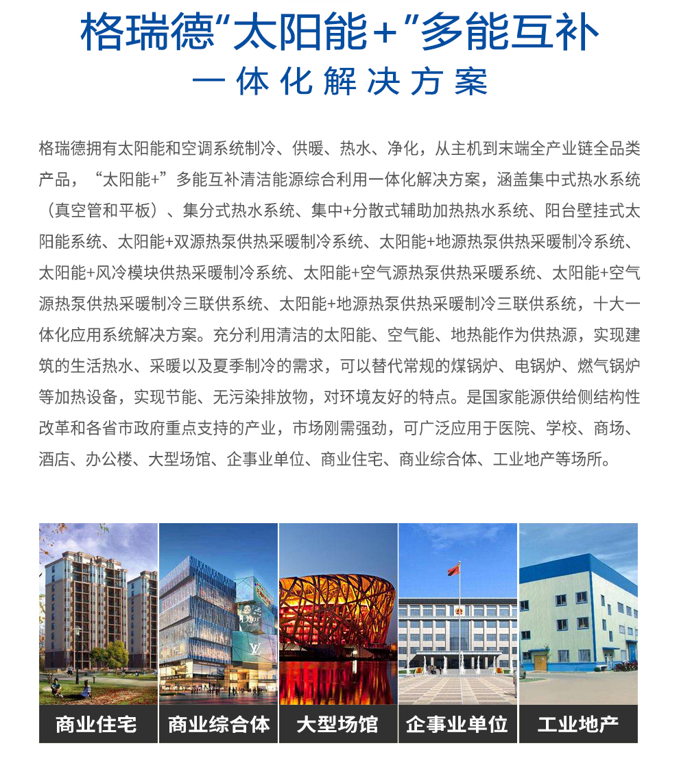 格瑞德1993年建立于山東德州,目前是一家圍繞人工環境,橫跨新能源、新材料、裝備制造、節能環保、信息技術五大戰略新型產業的企業集團。格瑞德進行全球化業務運作,產品和服務遍布全國的每一個省市和全球五大洲的100多個國家和地區,廣泛應用于基建工程、商業地產、工業制造、農業開發、電子信息、車輛工程、環保處理、醫藥凈化、海洋工程、軌道交通等領域。格瑞德從業人員過萬人,在山東、貴州、四川、新疆、內蒙等地建有生產基地,在上海、北京、濟南、蘭州以及美國洛杉磯建有研發中心。