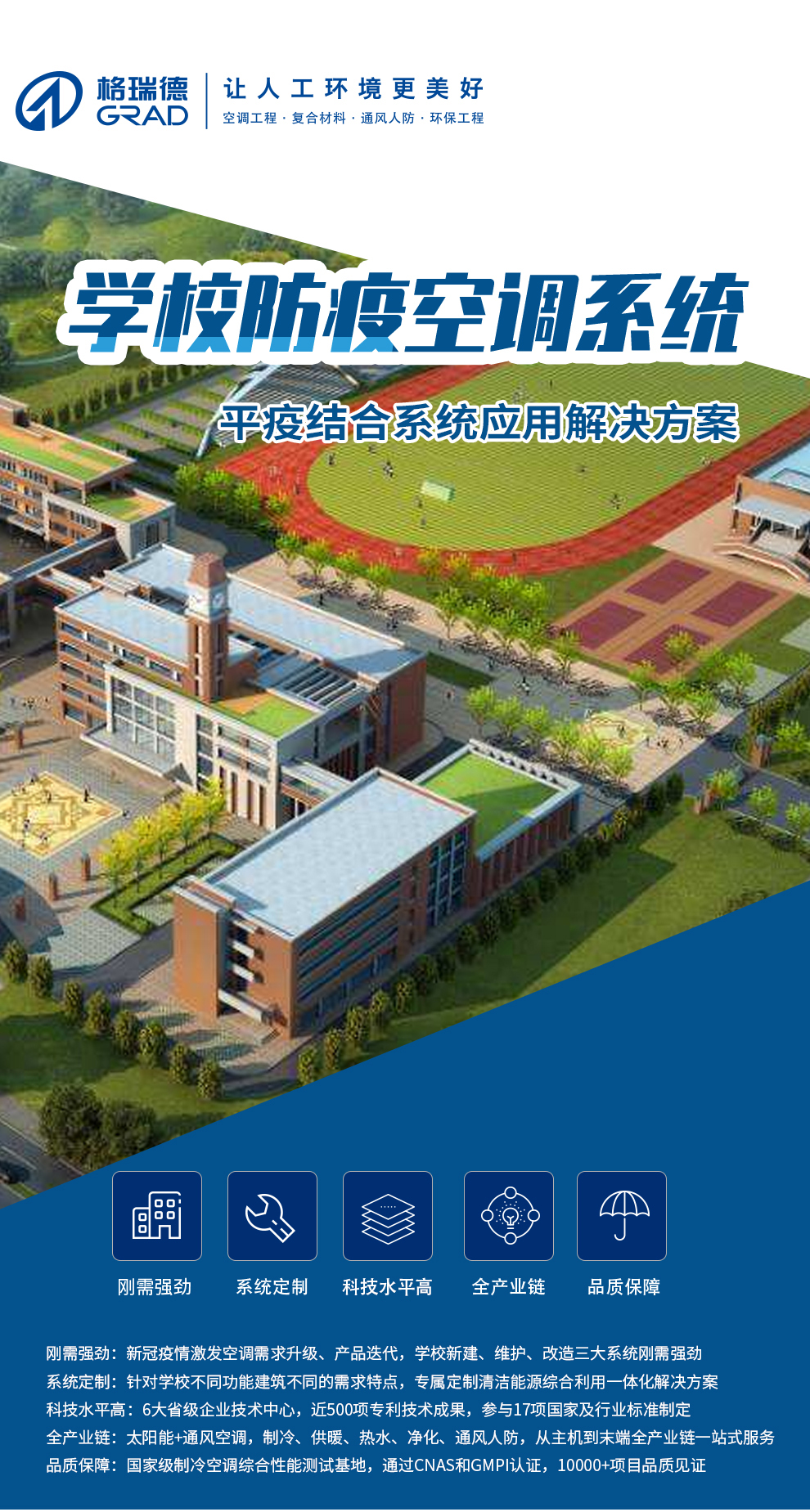 格瑞德1993年建立于山東德州,目前是一家圍繞人工環境,橫跨新能源、新材料、裝備制造、節能環保、信息技術五大戰略新型產業的企業集團。格瑞德進行全球化業務運作,產品和服務遍布全國的每一個省市和全球五大洲的100多個國家和地區,廣泛應用于基建工程、商業地產、工業制造、農業開發、電子信息、車輛工程、環保處理、醫藥凈化、海洋工程、軌道交通等領域。格瑞德從業人員過萬人,在山東、貴州、四川、新疆、內蒙等地建有生產基地,在上海、北京、濟南、蘭州以及美國洛杉磯建有研發中心。