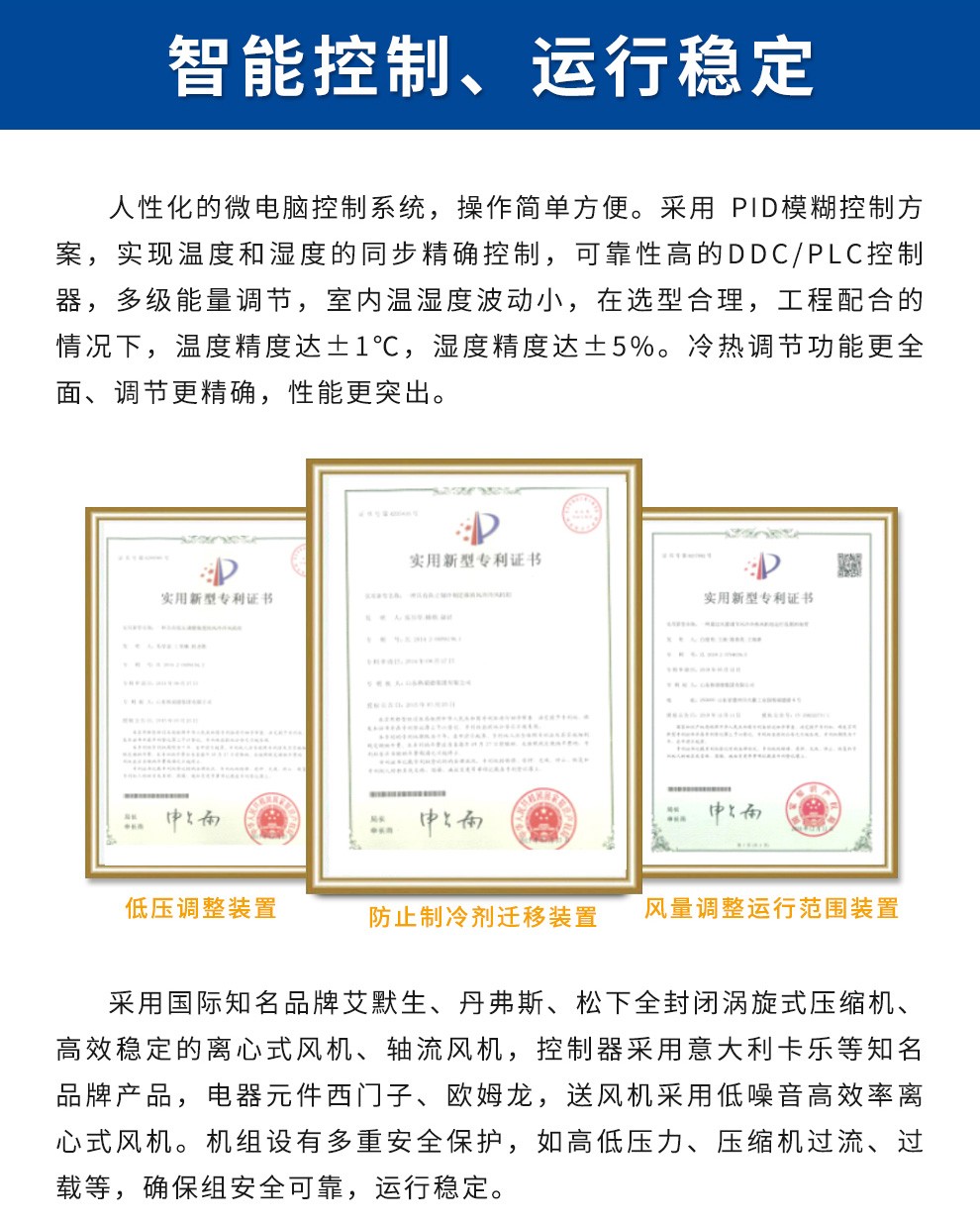 擁有國家機電設備安裝壹級資質,環境保護工程二級資質,建筑裝修裝飾工程專業承包二級資質,鋼結構工程三級資質,并獲得了中國制冷空調設備維修安裝資質,集團生產的空調產品獲得國家制冷設備生產許可證,3C中國國家強制性產品認證、CRAA中國制冷空調行業權威性產品性能認證,壓力容器國家特種設備設計、制造許可證,制冷主機、風機產品榮獲中國節能產品認證。