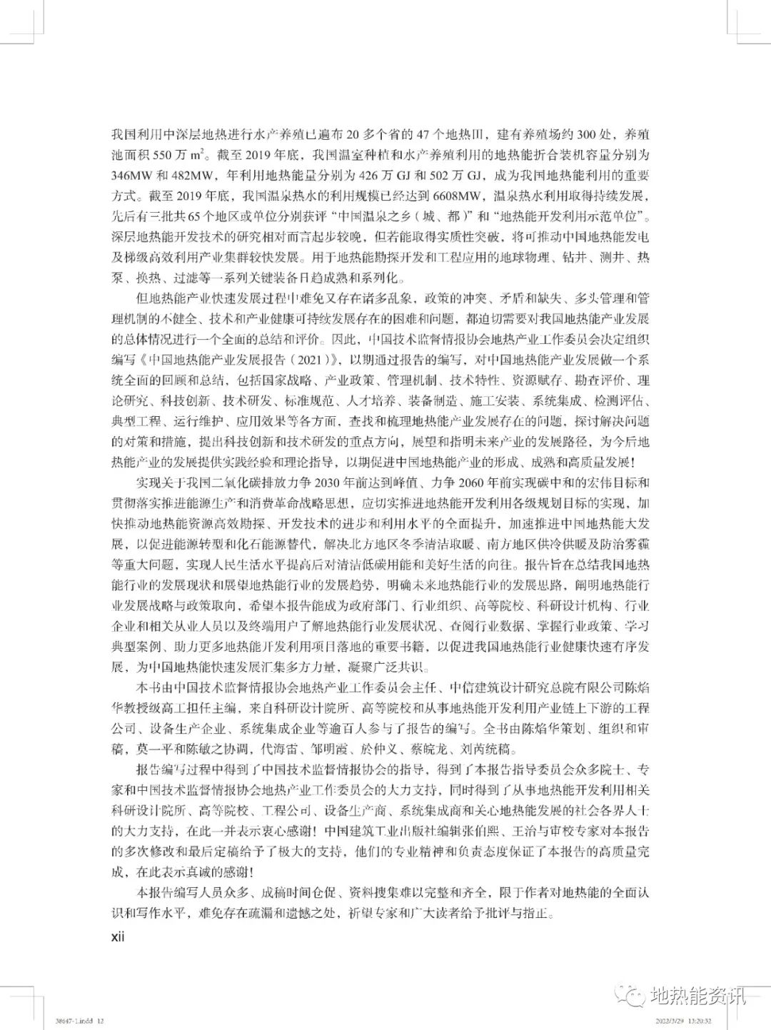 《中國地熱能產業發展報告(2021)》對我國地熱能產業發展做了較為系統全面的回顧和總結,包括國家戰略、產業政策、管理機制、技術特性、資源賦存、勘查評價、理論研究、科技創新、技術研發、標準規范、人才培養、裝備制造、施工安裝、系統集成、檢測評估、典型工程、運行維護、應用效果等各方面,查找和梳理地熱能產業發展存在的問題,探討解決問題的對策和措施,提出科技創新和技術研發的重點方向,展望和指明未來產業的發展路徑,為今后地熱能產業的發展提供實踐經驗和理論指導,以期促進中國地熱能產業的形成、成熟和高質量發展。