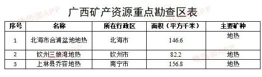 《規劃》以戰略性礦產、優勢礦產、產業發展急需礦產為重點,劃定了40個重點勘查區,其中有三個片區涉及地熱資源,包括北海市合浦盆地地熱、欽州三娘灣地熱、上林縣喬容地熱,總面積達385.6平方千米。