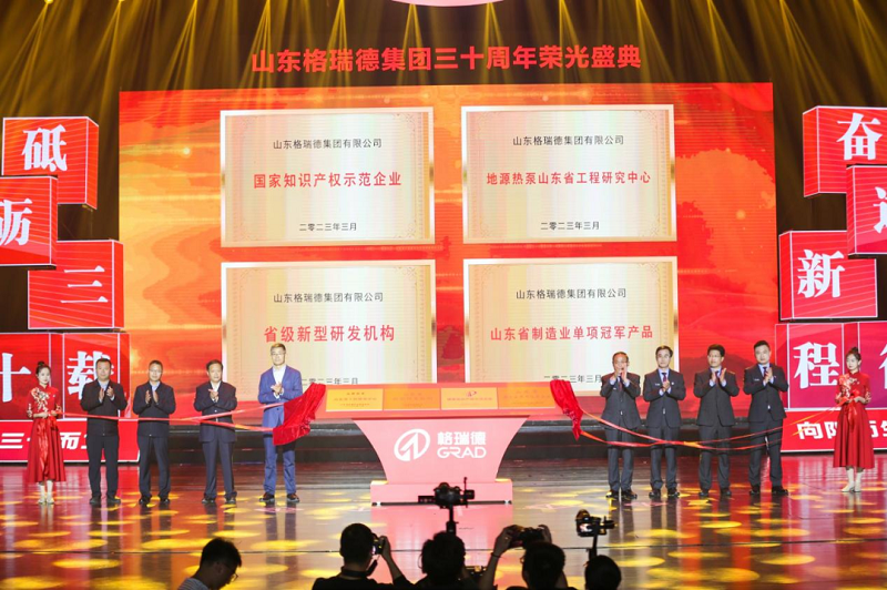 隨后,“國家知識產權示范企業”“地源熱泵山東省工程研究中心”“省級新型研發機構”“山東省制造業單項冠軍”四項揭牌項目由德州市工業和信息化局黨組書記、局長孫洪昌,德州市發改委三級調研員王福軍,德城區科技局黨組書記陳新剛,德城區市場監管局局長藺心懂、山東格瑞德集團有限公司副董事長王春和、監事長王春雷、執行總裁管志廣、總經理王志軍共同揭牌。