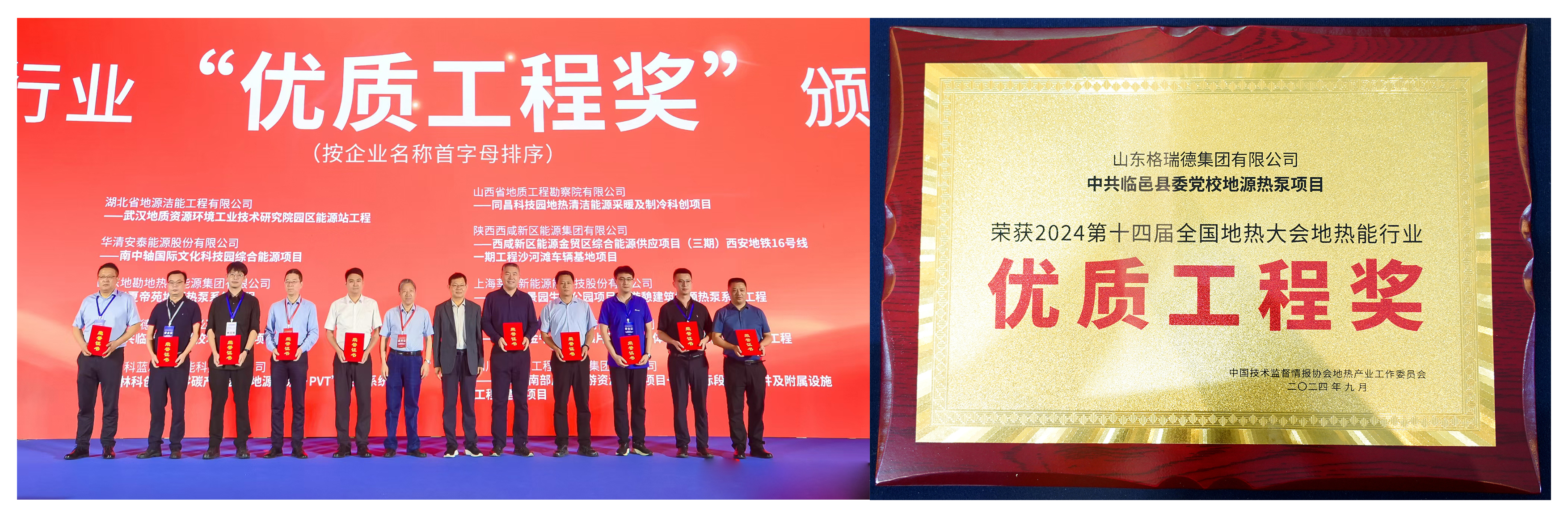 值得一提的是,集團在本次大會上憑借“高溫智慧節(jié)能能源一體機”獲得地?zé)崮苄袠I(yè)金質(zhì)產(chǎn)品獎,“中共臨邑縣委黨校地源熱泵項目”獲得地?zé)崮苄袠I(yè)優(yōu)質(zhì)工程獎。兩個獎項的獲得,標(biāo)志著集團不僅在地?zé)岙a(chǎn)品制造方面成就卓越,在系統(tǒng)工程承攬方面也具備超強實力,再次彰顯格瑞德集團在地?zé)嵝袠I(yè)的重要地位。